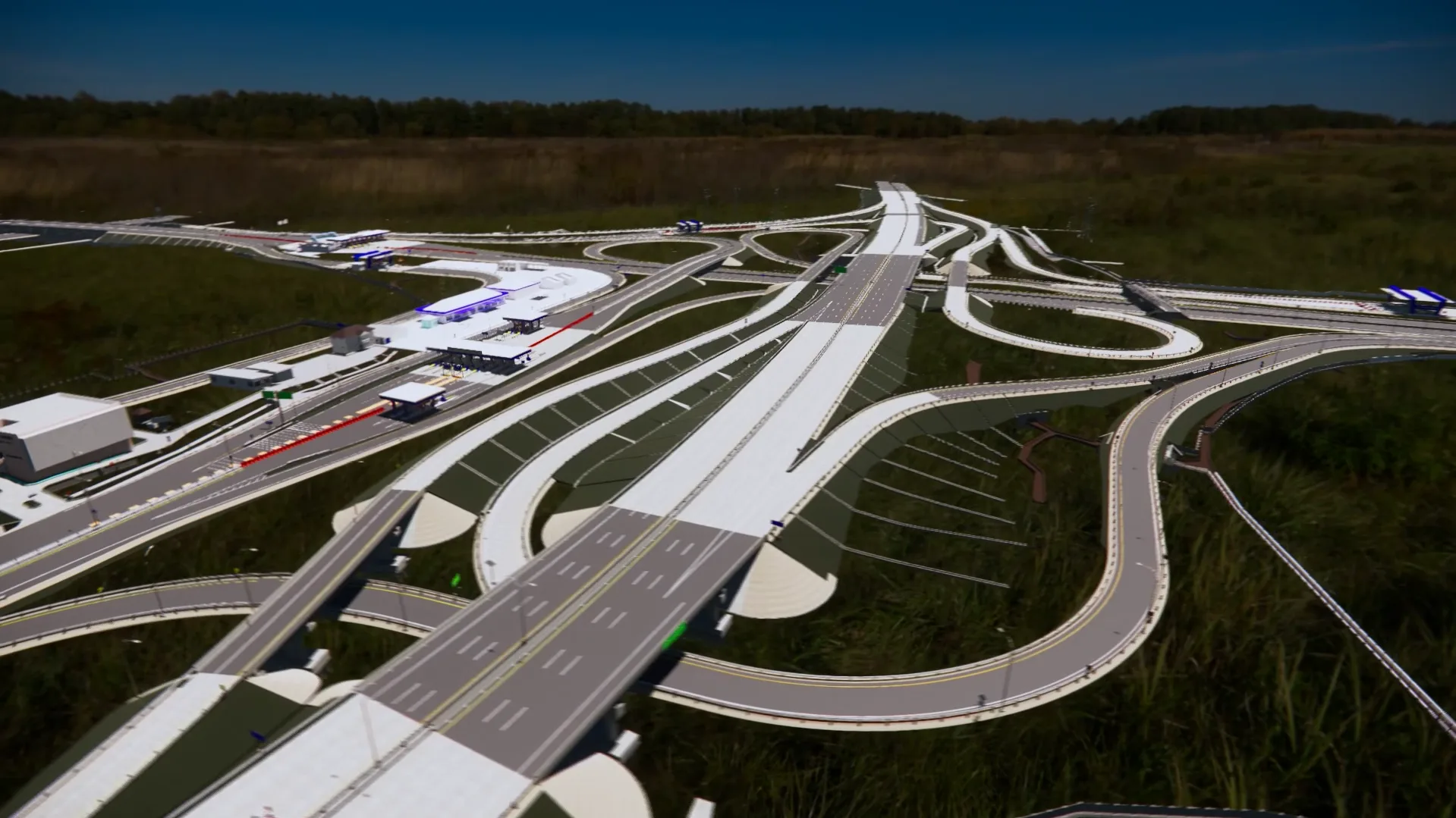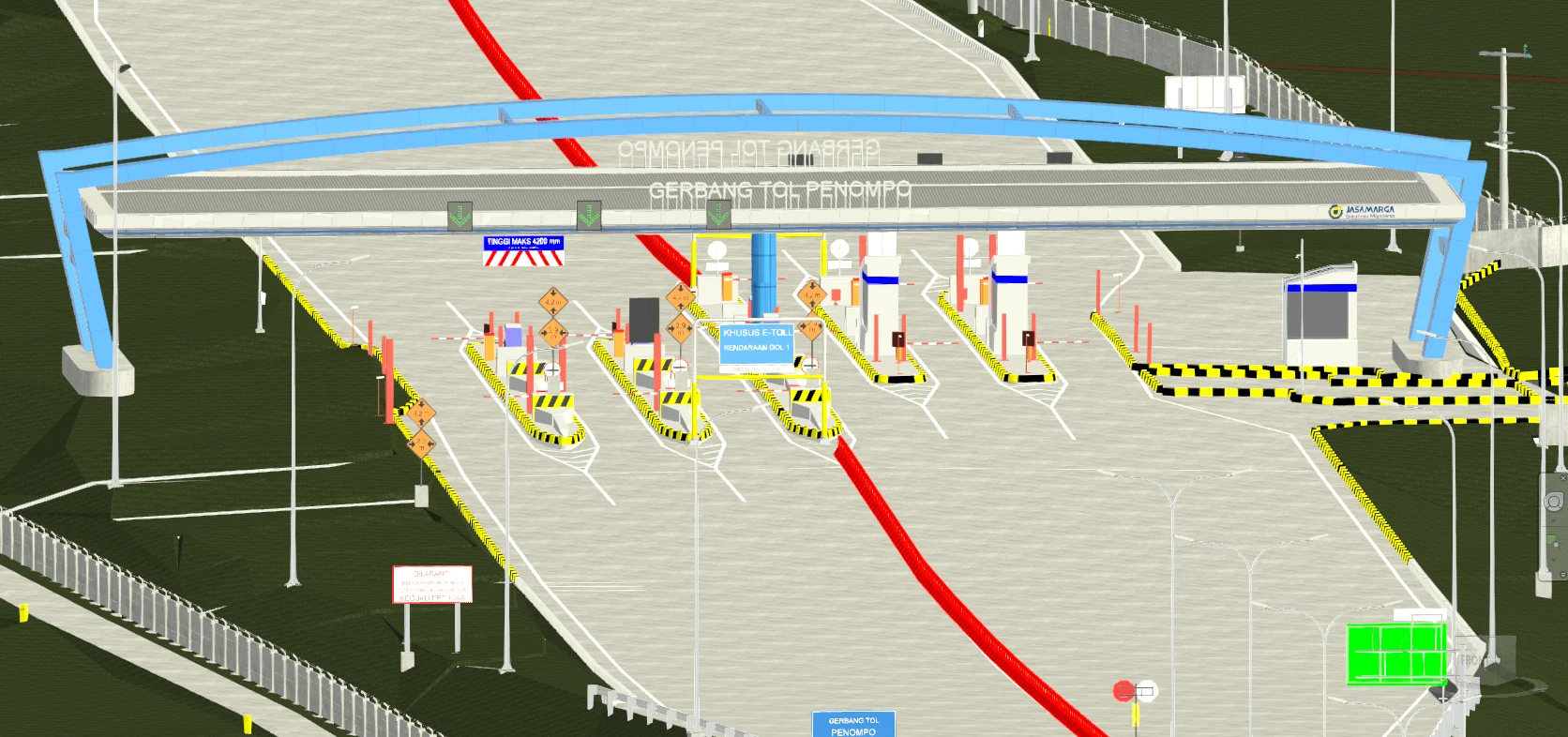 In addition, corridor objects were modeled across 12 areas, covering the main road, road markings, guardrails, parapets, and reflectors. Building objects included 12 toll gates, 9 toll offices, and 5 rest areas. The project also delivered 3D models of traffic signs, street lighting (PJU), CCTV, drainage systems, and toposolid for all 12 areas. The project was completed within 4.5 months.